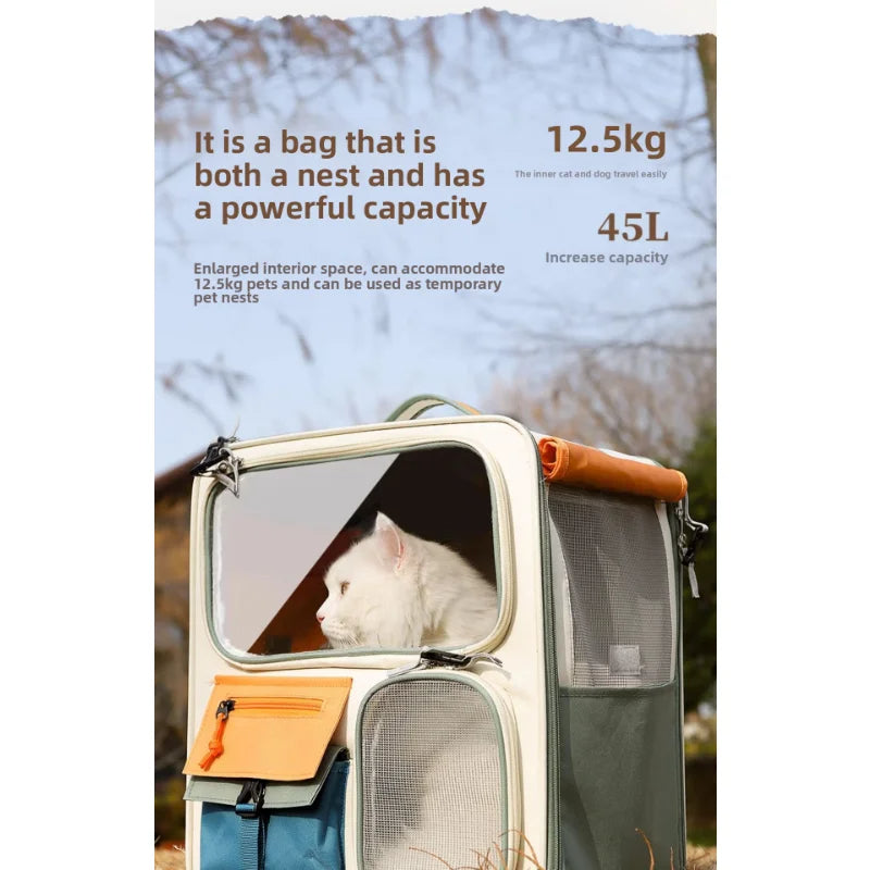 Designed for maximum comfort and functionality, the Tiny Tails Cat Backpack features an enlarged interior space, accommodating pets up to 12.5 kg (27.5 lbs). The 45L capacity ensures plenty of room for your pet to relax, while the breathable mesh panels provide excellent ventilation and visibility.